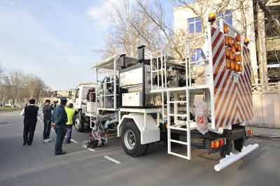 В Ташкенте прошли эксплуатационные испытания узбекско-немецкой дорожно-разметочной машины. Данный автомобиль предназначен для нанесения разметки – различных линий и знаков на дорожное полотно.