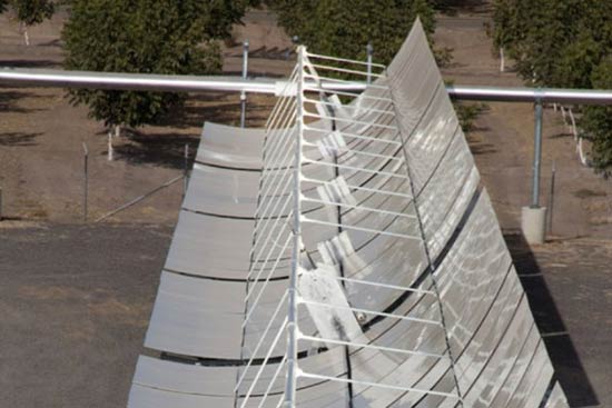 Панели-рефлекторы имеют особую параболическую форму, которая позволяет им фокусировать световой пучок, создавая в одной точке сверхвысокую температуру. Зеркала нагревают жидкость в замкнутом контуре, и образующийся пар приводит в движение турбину.