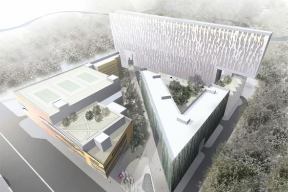 Здания объединяются в замкнутый мини-квартал. Здесь будут внутренняя улица, двор, небольшая площадь перед фойе спортивного центра, а также кафе, магазины, отделение банка, бытовые услуги, детские кружки и т. д. Авторы проекта считают, что квартал создаст полноценную городскую жизнь, которой не хватает в окружающем районе.
