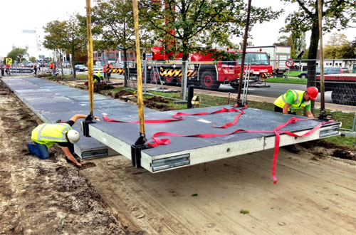 Первая такая дорожка длиной 70 метров была запущена 12 ноября 2014 г. в Кромени (пригород Амстердама). Проект разрабатывался с 2009 г. под эгидой голландского исследовательского института TNO. Солнечные ячейки из кристаллического кремния размером 2.5 x 3.5 м вмонтированы в бетонные плиты и прикрыты сверху закаленным стеклом сантиметровой толщины. Сверху на них нанесена полировка, а сами модули установлены с легким наклоном: так дождь будет быстрее смывать с них грязь, что обеспечит максимальную выработку энергии. Впрочем, из-за расположения плиток их эффективность снижена на 30% по сравнению с обычными солнечными панелями. К 2016 г. дорожку планируют довести до длины в 100 м — по прогнозам, она сможет снабжать электричеством три дома.