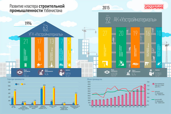 Доля промышленности строительных материалов в ВВП Узбекистана достигла 1,4%. Увеличение удельного веса современных стройматериалов обусловлено растущими инвестициями в отрасль. В 2014 году предприятиями компании было освоено $38,2 млн., прогноз на этот год – $68,2 млн. с приростом 38%.