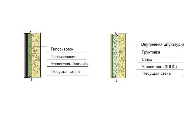 - Для выбора схемы утепления, необходимо понимать, какая будет отделка в помещении. Если это гипсокартон,- то лучше применить мягкие ватные утеплители (можно как плитные, так и рулонные, с плотностью до 50кг\м3), обязательно защитив со стороны помещения пароизоляционной пленкой. Подойдет как минеральная вата, так и вата из стекловолокна. Если планируется штукатурить стены, то применяется экструдированный пенополистирол (ЭППС), с группой горючести не выше Г1. При выборе необходимо учесть, что конструкция с ЭППС занимает на 20-30% меньше места по толщине, а значит, оставляет больше полезного пространства.