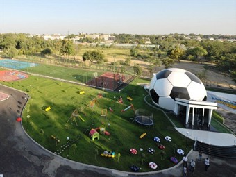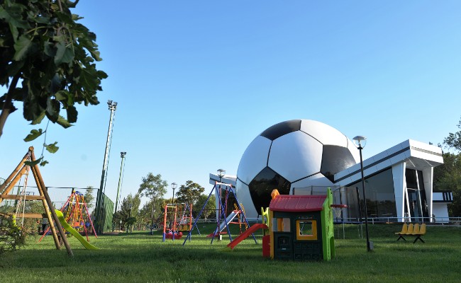 В здании в форме огромного футбольного мяча любители футбола смогут проводить время за просмотром матчей.