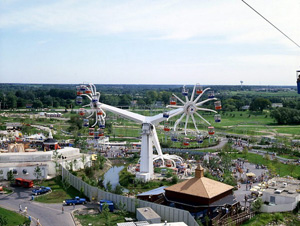 Sky Whirl – тройное колесо обозренияВ пригороде американского города Санта-Клара уже много лет существует колесо обозрения Sky Whirl, представляющее собой по сути целых три подобных аттракциона, объединенных в одну конструкцию. Пока одно из этих колес наполняется людьми, два остальных крутятся в воздухе.