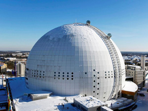 SkyView – рельсовое колесо обозрения в СтокгольмеСтокгольмская Глобен-Арена известна не только как одно из крупнейших в мире зданий для проведения концертов и спортивных состязаний, но и как основа для одного из самых необычных в мире колес обозрения. SkyView представляет собой два вагончика, которые передвигаются по рельсам, расположенным на крыше этого куполообразного сооружения.