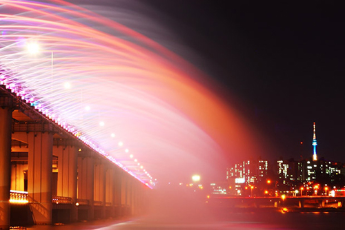 До 2008 года сеульский мост Банпо, соединяющий берега реки Хан, мало чем отличался от других. Но с появлением на нем необычного фонтана «Лунная радуга» он сразу же стал одной из главных городских достопримечательностей и даже сумел попасть в Книгу рекордов Гиннесса. Идея превратить мост в фонтан (своей функции переправы с одной стороны реки на другую Банпо также не потерял) пришла властям южнокорейской столицы не случайно. Это было сделано в рамках масштабного проекта, призванного возродить привлекательность Сеула в глазах туристов. Струи фонтана бьют по обеим сторонам моста Банпо, за одну минуты выбрасывая 190 т воды. Кроме этого, 10 000 светодиодных ламп окрашивают струи во все цвета радуги. Фонтан «Лунная дорога» отличается и экологической «дружелюбностью»: забор воды происходит из реки, куда она затем возвращается уже очищенной.