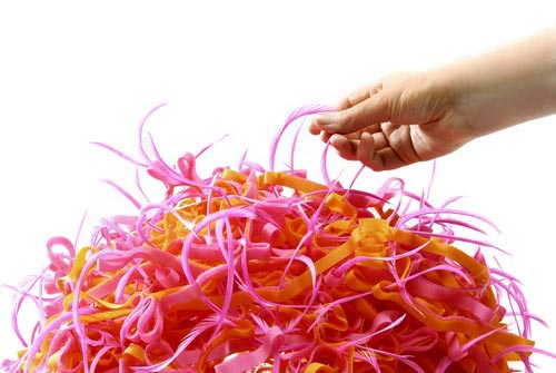 В руках дизайнера Рэйчел О'Нил лента велкро превратилась в абажур светильника. Для этого не потребовалось никаких дополнительных инструментов! Липучка велкро раскрывается, а затем соединяется произвольным образом: кудрями, петлями, кольцами. Чтобы изделие держало форму следует использовать металлический каркас от старого абажура.