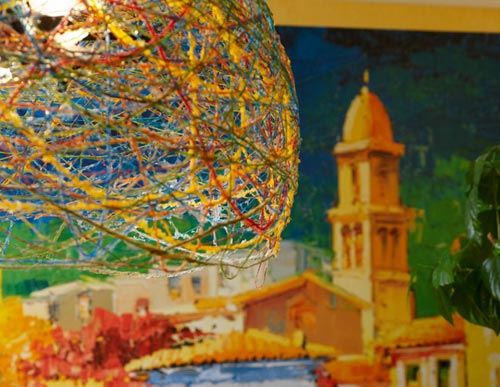 Надуваем, обмазываем клеем и методично наматываем клубок. Не старайтесь нанести слишком много клея, иначе процесс высыхания затянется на неделю, а белые нитки — пожелтеют. Все что вам останется: торжественно проткнуть шарик, надрезать верхнюю часть получившегося «клубка» и продеть в отверстие патрон с лампочкой. Желательно выбирать модели в матовой колбе, иначе яркий свет будет слепить глаза.Такие абажуры выглядит очень эффектно, а материалы стоят сущие копейки. Можно выбрать не только цвет абажура, подобрав нитки на свой вкус, но и его форму – сферу или полусферу.