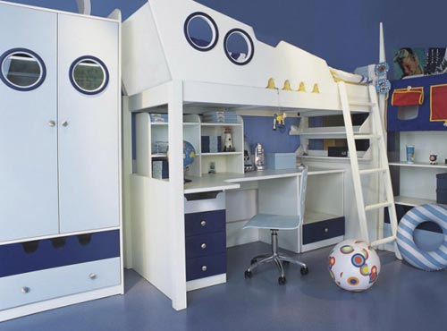 Космическую тематику создать довольно просто: уже давно продаются обои на стены и потолок со светящимися по ночам звездами и планетами. Довольно много различных ламп, светильников, статуэток в форме космических кораблей. Если в комнате присутствует перегородка, или кровать находится на втором ярусе, то внизу можно проделать круглые окна, как на космическом корабле.