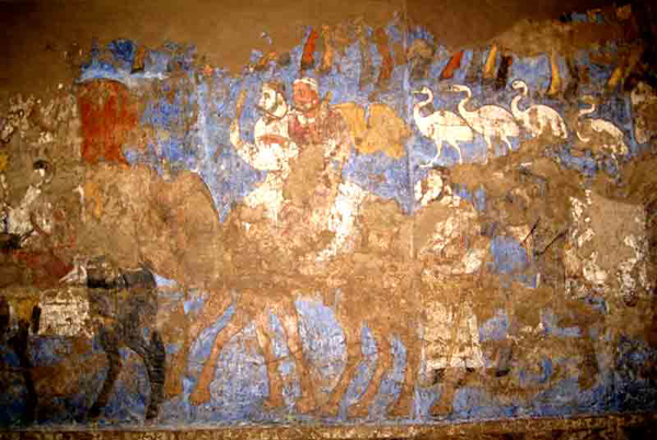 Уникальные жанровые картины, росписи располагаются на стенах в три яруса. Яркими красками изобразили сцены величественного шествия мужчин, несущих богатые дары и одетых в праздничные нарядные костюмы, движение к храму столицы, сцены борьбы и охоты, изображение водного царства. Обнаруженные настенные росписи в оригинале сегодня представлены в музее «Афросиаб».
