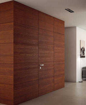Еще одно новое интересное конструктивное решение - дверь с потайной коробкой Filomuro, полностью обшитая деревянными стеновыми панелями, в точности такими же, как прилегающие стены.