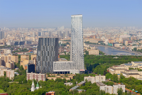 Пятое место занял "Дом на Мосфильмовской" (девелопер "Дон-Строй Инвест") в Москве, выполненный архитектором Сергеем Скуратовым. Высота здания - 213 метров. Это жилой комплекс площадью 195 тыс. кв. м, построенный напротив павильонов "Мосфильма". С "Дома на Мосфильмовской" открываются потрясающие виды на Москву.