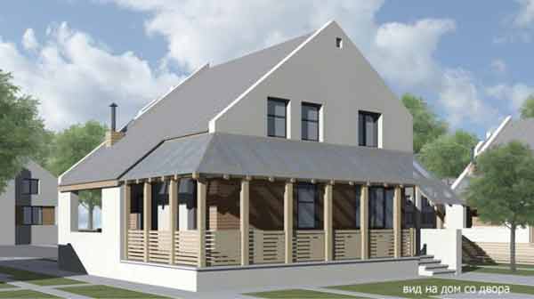 Наш индивидуальный жилой дом имеет традиционную двухскатную кровлю, конек которой мы ощутимо смещаем относительно центральной оси. Это придает силуэту коттеджей большую выразительность. И если на облике самой кровли подобная сдвижка никак не отражается, то облик боковых фасадов всецело продиктован ее тектоникой: с помощью узкой деревянной вставки фронтоны расщеплены на две половинки, которые словно существуют независимо друг от друга. На сочетании двух основных материалов – белой штукатурки и натурального дерева – и строится образ этого дома: за счет деревянных панелей разного размера мы визуально дробим фасады, лишая их ощущения монолитности. Эту же задачу решают оконные проемы, которые мы специально делаем разными (используя для этого рамы стандартных размеров, естественно), а также ниши входного крыльца и просторной веранды с обратной стороны дома. Кровлю над верандой мы предлагаем выполнить из полупрозрачного поликарбоната, – вставка из него врезана в скат кровли под собственным углом, что еще немного усложняет силуэт сооружения , придает ему некоторую пикантность.
