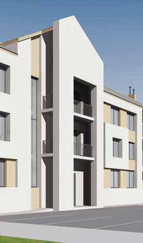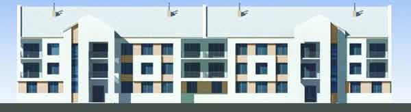 Еще более сложной кажется структура трехэтажного многоквартирного дома. Основу его палитры также составляют белый цвет и светлый оттенок натурального дерева, но мы компонуем из панелей более сложные композиции, позволяющие разнообразить протяженные фасады. Обогащают их пластику и выдвинутые из «тела» основного объема лестничные блоки, увенчанные двухскатной кровлей с очевидно смещенным коньком.