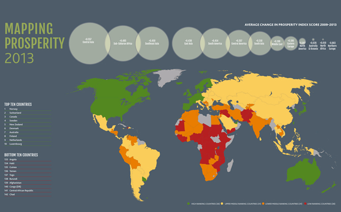 Согласно рейтингу, Узбекистан занял 71 место в категории экономика (67 место в 2012 году) и 18 место в категории социальный капитал (17 место), 92 место в категории предпринимательство (98 место), 66 место в категории образование (65 место), 65 место в категории здравоохранение (72 место), 63 место в категории безопасность (66 место), и 78 место в категории личные свободы (70 место).