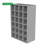 Открытые полки, без дверей (возможен вариант исполнения с дверьми из стекла толщиной 5 мм). Разделен на 24 отделения.