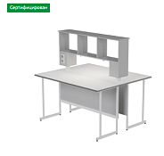 Островные столы физические лабораторные (модели 2400-СОфСл, 2400-СОфК, 2400-СОфТЛ) состоят из соединенных без зазоров четырех столов. При этом, два стола шириной 800 мм и два шириной 600 мм соединены и по длине, и по ширине. На двух более широких столах прочно установлены две технологические надстройки. Технологическая надстройка представляет собой конструкцию, прикрепляемою к столешнице стола при помощи болтов и гаек М8. Основание надстройки выполнено из химически стойкого пластикового короба. На стойках надстройки расположена сервисная панель с 2 пыле- влагозащитными розетками на 220В со степенью зашиты IP 65. Верх настройки разделен на три части при помощи вертикальных перегородок, что позволяет свободно размещать на них малогабаритное лабораторное оборудование, инструментарий, а также различные бумаги, материалы, документы и т.п. Под надстройкой расположен люминесцентный светильник (IP 20) с выключателем на корпусе, мощностью 15 Вт., обеспечивающий комфортное освещение всей рабочей зоны стола.