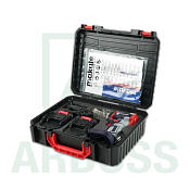 - Комплектация: Шуруповерт, 2 аккумулятора (2.0 А·ч), зарядное устройство, пластиковый кейс, набор бит (6 шт.), набор сверл (3 шт.)