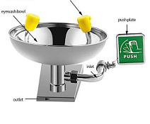 Аварийный фонтан для глаз устанавливается на стену, имеет 2 распылителя для промывки обоих глаз одновременно. Укомплектован круглой метал. раковиной для сбора воды, вентилем подачи воды.
