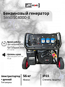 Бензиновый генератор Gasoline Generator Senci SC4000-II, 220V/50Гц, номинальная мощность 3,2 кВт, максимальная мощность 3,5 кВт, топливный бак 15 л, электрозапуск от аккумулятора. Панель управления включает: Трехфункциональный , автоматический выключатель, ключ электрозапуска, индикатор масла, заземляющий терминал, три розетки вместе с вилками. С колесами и ручкой.