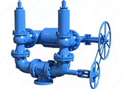 Блок предохранительных клапанов (БПК) – комплекс арматуры, состоящий из предохранительных клапанов 1 и переключающих устройств 2 и 3 (при необходимости между переключающими устройствами и предохранительными клапанами может быть установлен переходник 4), обеспечивающих постоянное соединение защищаемого от недопустимого повышения давления оборудования только с одним из предохранительных клапанов. С целью синхронного управления переключающие устройства соединены между собой цепной передачей. При вращении маховика одного из переключающих устройств происходит одновременное перемещение запорного органа обоих переключающих устройств, отключение одного предохранительного клапана (например, для технического обслуживания) и подключение другого. Каждый маховик при закрытии должен подтягиваться индивидуально.