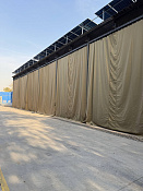 Изготавливаем любой размер под заказ с возможностью установки люверсов или креплений. На фото показан пример использования — укрытие склада для защиты сырья от внешних воздействий.