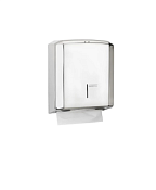 Держатель бумажных полотенец в пачках WALL MOUNTED V,C,Z-сложения. Благодаря своей конструкции диспенсер относится к классу антивандальных. Держатель для бумажных полотенец запирается на верхний ключ. Материал корпуса выполнен из нержавеющей стали AISI 304 с глянцевой отделкой. Держатель снабжен смотровым окошком для контроля наличия бумаги. Имеет механизм-тормаз, который оптимизирует и дозирует подачу бумаги в дозаторе. Вместимость – 400-600 листов.