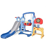 Детский комплекс 5в1 состоящий из: горки с баскетбольным кольцом, качели на веревках и отдельная баскетбольная стойка с кольцом, игра "Дартс" на магнитах, снизу ворота с сеткой для мини-футбола и 2 мяча в комплекте.