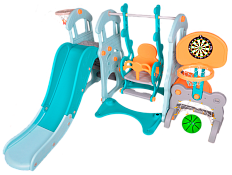 Детский комплекс 5в1 состоящий из: горки с баскетбольным кольцом, качели на веревках и отдельная баскетбольная стойка с кольцом, игра "Дартс" на магнитах, снизу ворота с сеткой для мини-футбола и 2 мяча в комплекте.
