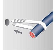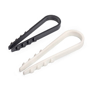 Дюбель-хомут представляет собой полоску пластика, согнутую в виде скобы. На концах ее имеются зубчики. Когда дюбель вставляют в отверстие в стене, зубчики упираются в материал стены и обеспечивают вполне надёжное крепление.