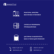Компания производит емкостное оборудование для различной промышленности. Мы участвуем в разработке и предлагаем индивидуальные решения для производства, обеспечивая производительность, экономичность и длительность срока службы. Производимые ёмкости и оборудование подходят для самых разных отраслей - пищевую, химическую, фармацевтическую и строительную промышленности. * Мы проектируем емкостное оборудование под линию и технические требования клиента. * Работаем с различной сталью и материалами для пищевой, химической и других отраслей. * Собираем емкости, которые заменяют импортные аналоги и сокращают ваши затраты на доставку и обслуживание. * Предоставляем гарантию на каждое свое изделие и оказываем услуги долгосрочной поддержки. **Ассортимент нашей продукции** * Ёмкости и резервуары из нержавеющей стали * Горизонтальные и вертикальные ёмкости. * Открытого и закрытого типа. * С обогревом (паровым, электрическим, газовым) и охлаждением. * С теплоизоляцией. * С перемешивающими устройствами. * Оснащённые люками, предохранительными клапанами, CIP-мойками. * Термосные ёмкости для жидкостей. **Пищевое оборудование** * Молочное оборудование: пастеризаторы, заквасочные установки, варочные котлы * Оборудование для переработки фруктов и овощей * Котлы и реакторы для производства соусов * Масложировое оборудование: реакторы, вотаторы, кристаллизаторы * Пивоваренное оборудование: ЦКТ, форфасы, чаны и танки. **Фармацевтическое оборудование** * Реакторы для растворов. * Мерники для спирта. * Спиртохранилища. * Смесители конусные и U-образные. **Химическое оборудование** * Варочные чаны для бытовой химии. * Реакторы под давлением. * Вакуумные миксеры. * Колонны (спиртовые, бражные, ректификационные). * Дефлегматоры и холодильники. **Нейтральное оборудование** * Нержавеющие столы, стеллажи и тележки. * Площадки и лестницы. **Накопители и хранилища** * Силосы для цемента и смесей. * Баки для воды и других жидкостей (от 500 литров до 300 м³). * Ёмкости для очищенной воды. **Нестандартное оборудование** * Теплообменники, змеевики. * Трапы и лотки канализационные. * Воздуховоды вентиляционные. * Шнеки и транспортеры. **Дополнительные услуги** * Аргоновая и электродная сварка труб и металлов. * Монтаж промышленных линий и трубопроводов. * Сборка нестандартных металлоконструкций. * Долгосрочное обслуживание оборудования. Реализуем проекты на различных объектах по всей Республике Узбекистан.
