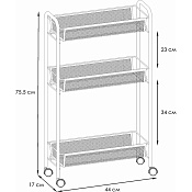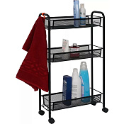 Этажерка, органайзер «Ладья 1К» отлично подходит для хранения хозяйственных вещей в ванной комнате, спальне, прихожей, офисе. Три вместительные полки, размещенные на разной высоте, позволяют класть разные предметы и не затрудняет доступ к ним. Максимальная допустимая нагрузка на одну корзину до 10 кг. Сама конструкция изготовлена из прочной, высококачественной стали, повышающей износостойкость изделия, что увеличивает срок службы. Также ее ножки оснащены небольшими колесиками, с помощью которых ее можно с легкостью перекатывать с одного места на другое.
