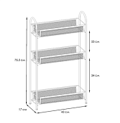 Этажерка, органайзер «Ладья 13» отлично подходит для хранения хозяйственных вещей в ванной комнате, спальне, прихожей, офисе. Три вместительные полки, размещенные на разной высоте, позволяют класть разные предметы и не затрудняет доступ к ним. Максимальная допустимая нагрузка на одну корзину до 10 кг. Сама конструкция изготовлена из прочной, высококачественной стали, повышающей износостойкость изделия, что увеличивает срок службы.