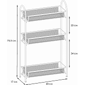 Этажерка, органайзер «Ладья 13» отлично подходит для хранения хозяйственных вещей в ванной комнате, спальне, прихожей, офисе. Три вместительные полки, размещенные на разной высоте, позволяют класть разные предметы и не затрудняет доступ к ним. Максимальная допустимая нагрузка на одну корзину до 10 кг. Сама конструкция изготовлена из прочной, высококачественной стали, повышающей износостойкость изделия, что увеличивает срок службы.