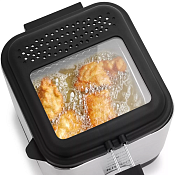 Мощность в 900 Вт обеспечивает быстрый нагрев масла и равномерную прожарку продуктов. Температура регулируется до 190 °C — это позволяет готовить не только картошку фри, но и куриные наггетсы, рыбу, овощи и пончики.