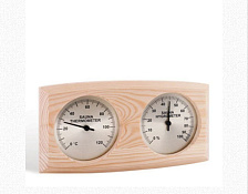 Термогигрометр от компании SAWO имеет прямоугольную форму. В широкой рамке из древесины сосны находится два круглых окошка. Под стеклом каждого окошка расположен графичный циферблат. Один из них - это гигрометр, другой - термометр. Данный прибор прекрасно подойдет для использования в любом парильном помещении.