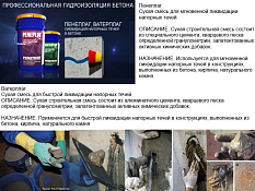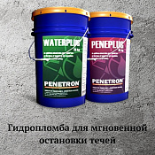 В линейку гидроизоляционных материалов ПЕНЕТРОН входят следующие разновидности гидропломб: «Пенеплаг» и «Ватерплаг». С помощью данных материалов эффективно и быстро останавливаются любые напорные течи. «Пенеплаг» и «Ватерплаг» представляют собой быстросхватывающиеся расширяющиеся водонепроницаемые составы, обладающие высокой связующей способностью, применяемые для устранения даже фонтанирующих под давлением течей. Являясь в изначальном виде сухой смесью, эти материалы при смешивании с водой образуют быстросхватывающиеся пломбирующие гидроизоляционные составы, готовые к применению.