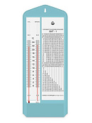 Гигрометры психрометрические ВИТ-1, ВИТ-2 предназначены для измерения относительной влажности и температуры воздуха в помещении. Гигрометр психрометрический типа ВИТ представляет собой прибор, собранный на основании из фенопласта или других материалов, аналогичных по свойствам. К основанию крепятся два термометра со шкалой, психрометрическая таблица, стеклянный питатель, заполняемый дистиллированной водой. Резервуар термометра под надписью "Увлажн." увлажняется из питателя с помощью фитиля из батиста или шифона. Метод измерения относительной влажности гигрометром психрометрическим (ВИТ-1 и ВИТ-2) основан на зависимости между влажностью воздуха и психрометрической разностью - разностью показаний "сухого" и "увлажненного" термометров, находящихся в термодинамическом равновесии с окружающей средой. Сняв показания термометров и вводя поправки в их показания, определяют разность показаний термометров. Затем по показанию "сухого" термометра и разности показаний "сухого" и "увлажненного" термометров определяют относительную влажность воздуха по психрометрической таблице.