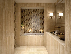 Тип плитки: Изощренный декор для ректифицированной плитки 30x90. Разработанный дизайн с блестящей и матовой аппликацией рельефных мазков, застилающих травертиновое дно основы. Вертикальная укладка, рекомендуется сцеплять детали для достижения более динамичного рисунка.