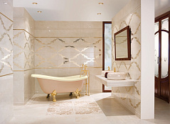 Тип плитки: Элегантная декоративная деталь из PVD бежевого цвета, на которую нанесены орнаментальные графические изображения . Идеальный вариант для комбинации с белой или плиткой или отделкой под мрамор