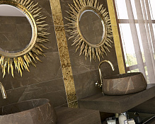 Тип плитки: Элегантная декоративная деталь из PVD золотистого цвета, на которую нанесены орнаментальные графические изображения в блестящих и матовых тонах. Идеальный вариант для комбинации с белой или плиткой или отделкой под мрамор