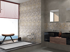 Тип плитки: Оригинальная современная ректифицированная плитка формата 30×90 см с текстурой цемента и легким рисунком, напоминающим сучковатую древесину. Светлый оттенок.