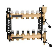 Коллектор с индикаторными термометрами CALEFFI ОПИСАНИЕ: Коллектор предварительного сбора. Максимальное рабочее давление: 10 бар. Диапазон температуры: 5+80°С. Расстояние между центрами выходов: 50 мм. Состоит из: - коллектора обратки, укомплектованного вентилями-отсекателями, подготовленными к электротепловому приводу; - коллектора подачи, укомплектованного микрометрическими клапанами предварительной настройки; - концевых групп, укомплектованных автоматическим воздухоотводчиком и сливным краном; - крепежных кронштейнов из полимера с регулируемым расстоянием между центрами для шкафа серии 659 или непосредственной настенной установки.