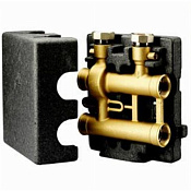 Модули быстрого монтажа VARIMIX – продуманные конструкторами, компактно собранные и теплоизолированные в заводских условиях арматурные узлы. Их применение позволяет до минимума сократить время проектирования и монтажа системы теплоснабжения коттеджа, таунхауса, небольшого коммерческого объекта и т.д., избежать проектных и монтажных ошибок. При этом стоимость готового модуля ниже стоимости аналогичного по составу набора элементов, приобретаемых по отдельности. В системе VARIMIX модули служат для распределения теплоносителя к насосным группам и насосно-смесительным узлам отопительных контуров (к каждому модулю присоединяется один контур). Коллекторные модули могут последовательно соединяться между собой в блоки. Материал трубопроводов модуля – бронза марки OTS 60PB2 (EN 1982-00). Модули комплектуются встроенными шаровыми кранами (на отводах), теплоизоляцией из пенополистирола, средствами крепежа и полусгонами с накидными гайками для подключения насосных групп и насосно-смесительных узлов. Сборка коллекторов между собой и с гидравлическим разделителем осуществляется с помощью сдвоенного резьбового ниппеля VT 606 (диаметр – 1 1/4"). Условный диаметр отходящих патрубков – 32 мм. Максимальная тепловая мощность присоединенной системы – 104 кВт (при Δt = 20 °С).
