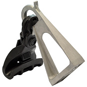 Подвижное соединение позволяет зажиму двигаться в продольном и поперечном направлениях. Выступ на кронштейне не позволяет зажиму вывернуться вверх. Кронштейн имеет специальный выступ для фиксации крюка раскаточного ролика при раскатке провода.