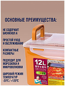 — Объём: 12 л (12000 мл) — Материал: безопасный пластик без BPA (без Бисфенола А) — Температурный режим: от -20 °C до +120 °C — Подходит для морозильной камеры и микроволновки — Можно мыть в посудомоечной машине — Форма: прямоугольная — Цвет: оранжевый