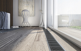 Конвектор водяного отопления с принудительным движением воздуха через нагревательный элемент. Прибор, встраиваемый в пол вдоль окон и дверных проемов помещений, предназначен, в том числе, для экранирования холодного воздуха, идущего от окон с большой площадью остекления.