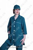 Каталожный номер: Куртка - 7045; Брюки - 7047; <br><br>Особенности модели: <br>Костюм подходит для работников сферы услуг (горничных/уборщиц) и торговли. Куртка для горничной свободного покроя на пуговицах, с одним грудным и двумя нижними накладными карманами, рукавом «три четверти». Брюки уборщицы прямые с резинкой и шнурком по талии, с карманами в боковых швах. По воротнику, карманам и рукаву возможна отделка из контрастной ткани. <br><br>Цвет: голубой, тёмно-васильковый, зелёный, бордовый. <br><br>Ткань: 100% полиэфир <br><br>Размеры: с 44 по 56; рост 158-176 <br>