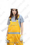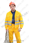ОПИСАНИЕ: Костюм состоит из куртки и брюк(полукомбинезона). Куртка с двойной световозвращающей полосой на талии и рукавах,центральная застежка на пуговицах с планкой. Брюки с застежкой на пуговицах с гульфиком на молнии.Манжеты на пуговицах.