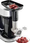 ** Зверская мясорубка на 100% из суперпрочного металла + самозатачивающийся нож + 2 диска: переработает в ровный фарш до 1.5 кг мяса в минуту.